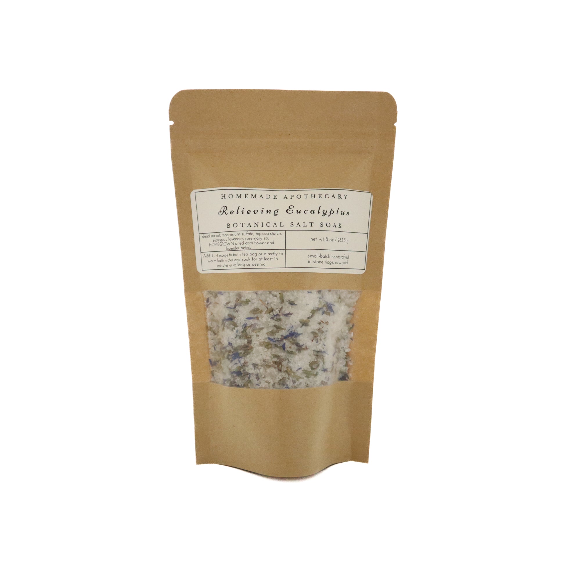 Ingredients: dead sea salt, magnesium sulfate, tapioca starch, eucalyptus, lavender, rosemary essential oil, HOMEGROWN dried corn flower and lavender petals